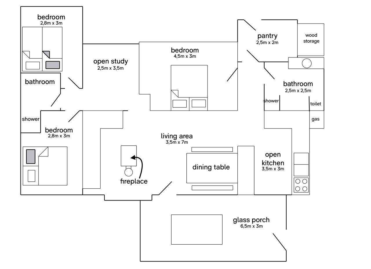 Het huis is ruim, gezellig ingericht met een grote keuken en huiskamer. Het huis heeft 3 slaapkamers ( 1 kamer met 2 eenpersoonsbedden wat op te maken is naar 1 tweepersoonsbed, 1 kamer met tweepersoonsbed en 1 kamer met bed wat uit te schuiven is naar 2 eenpersoonsbedden) met slaapgelegenheid voor 6 personen en 2 badkamers.